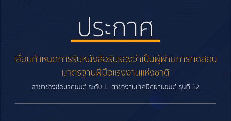 Uncategorized เลื่อนกำหนดการรับหนังสือรับรองว่าเป็นผู้ผ่านการทดสอบมาตรฐานฝีมือแรงงานแห่งชาติ สาขาช่างซ่อมรถยนต์ ระดับ 1 สาขางานเทคนิคยานยนต์ รุ่นที่ 2208/10/202108/10/2021